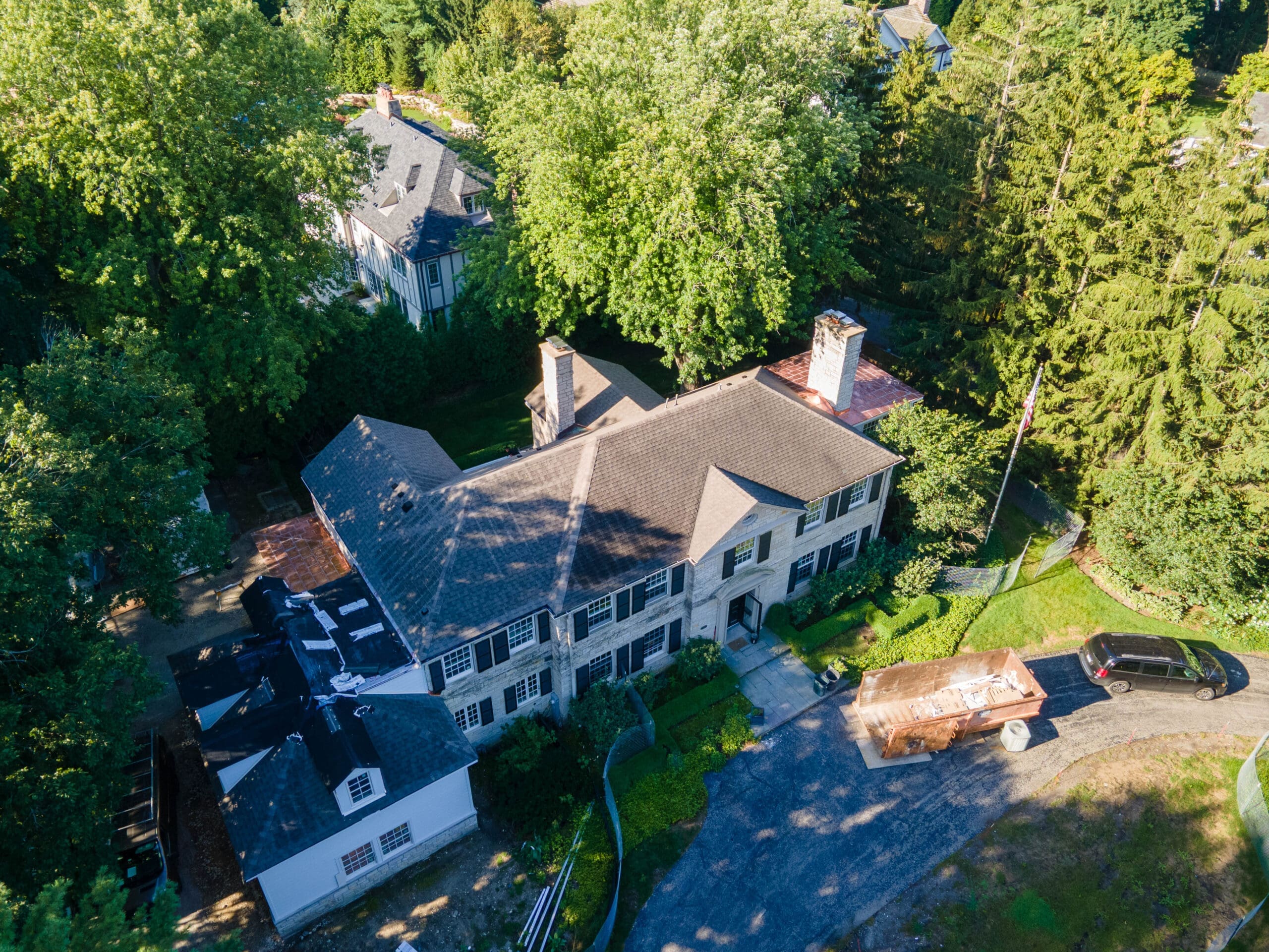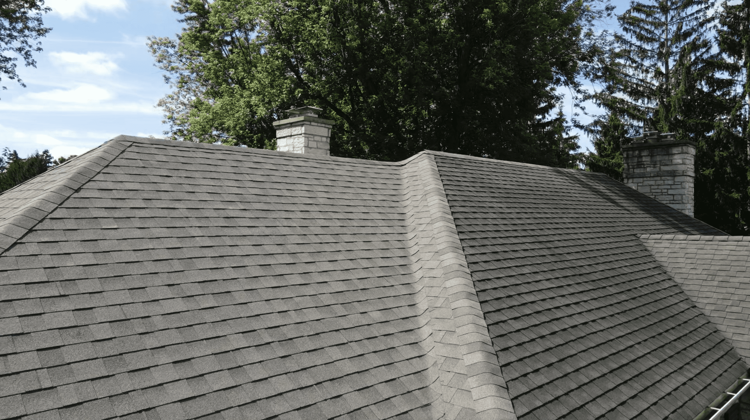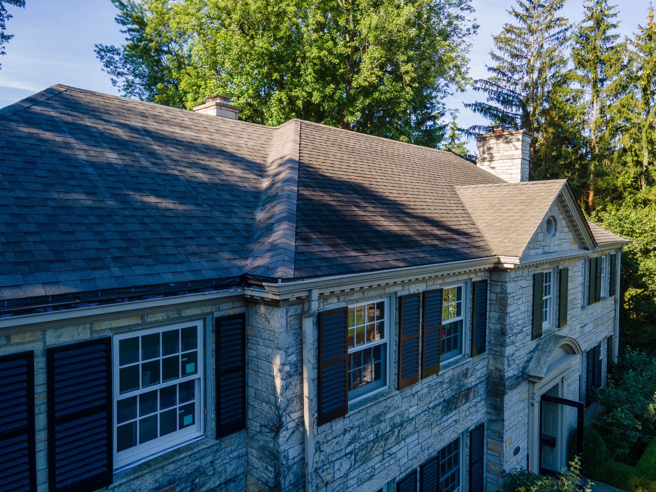 Working closely with the architect, designer, and general contractor, our roofing specialists developed a roofing plan that balanced aesthetics with long-term performance. Architectural asphalt shingles were installed across the primary roof surfaces to create a consistent, textured appearance.