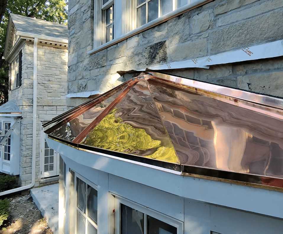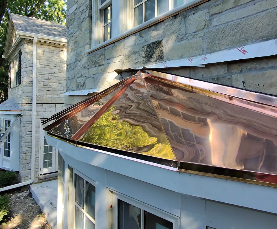 Custom Copper Work: Flat-lock and standing seam copper installed on accent roof sections.