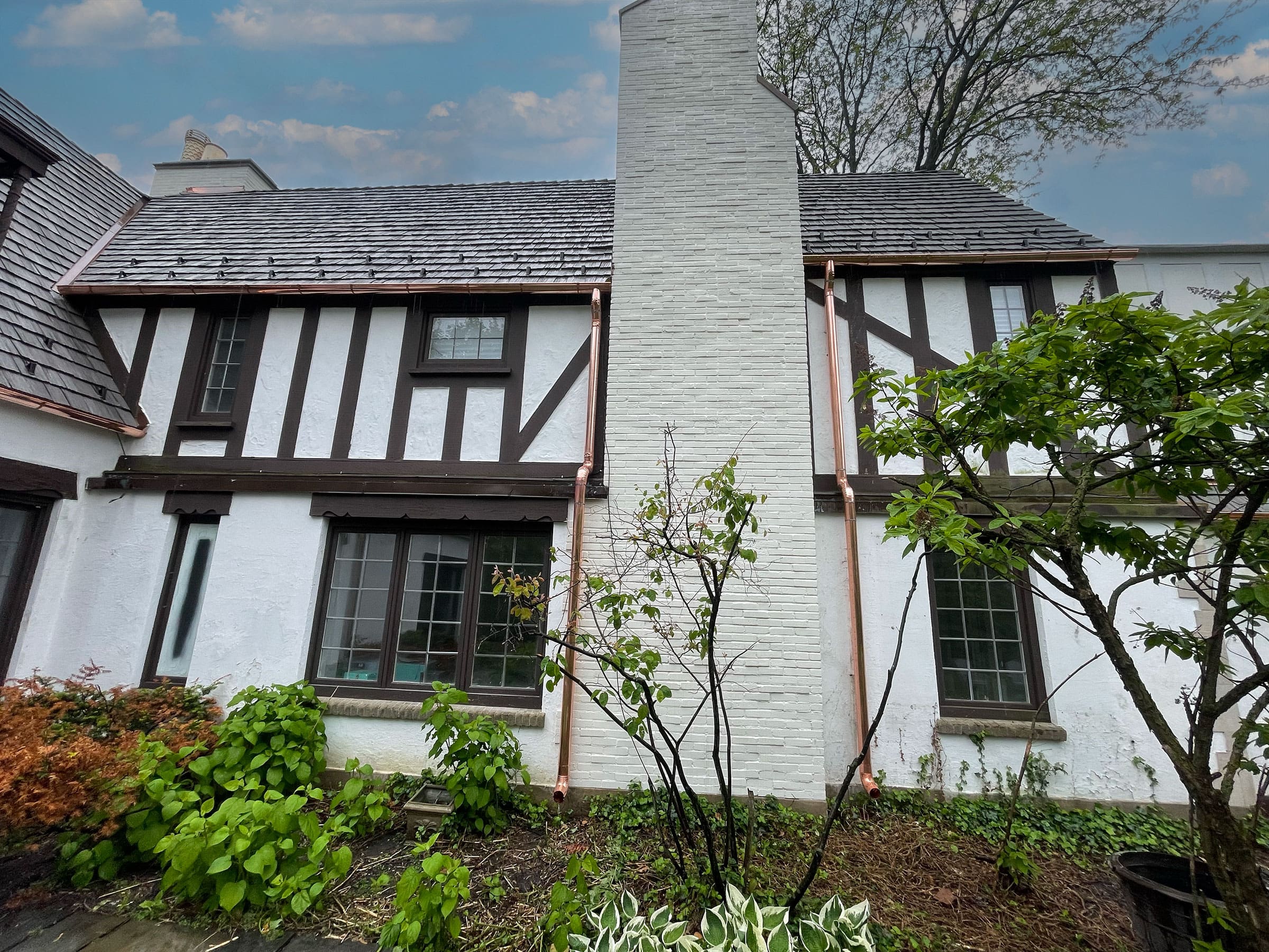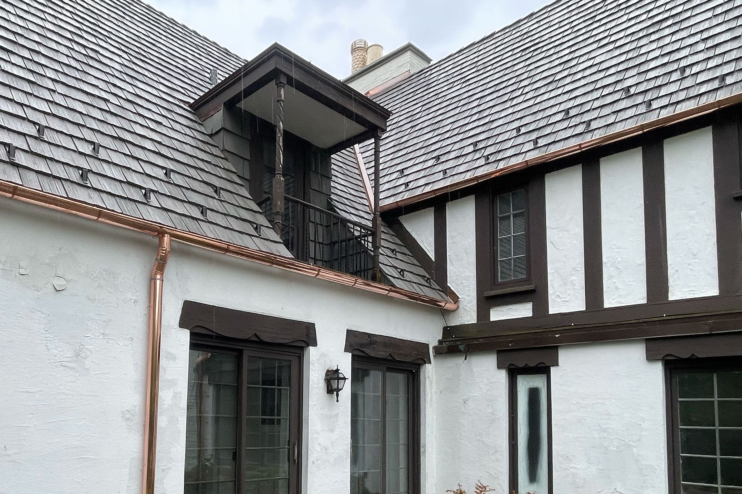 The Brava synthetic shake tiles were installed in staggered courses to achieve natural shadow lines and depth, enhancing the home’s cottage-style character. To complete the system, we fabricated and installed copper half-round gutters, round downspouts, and custom flashing details—all crafted in-house for precision and longevity.