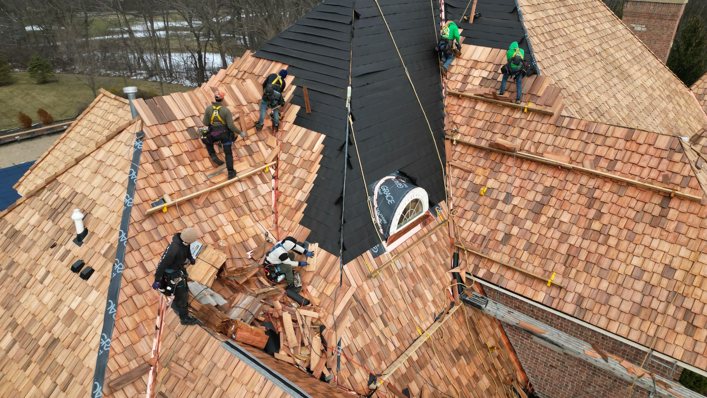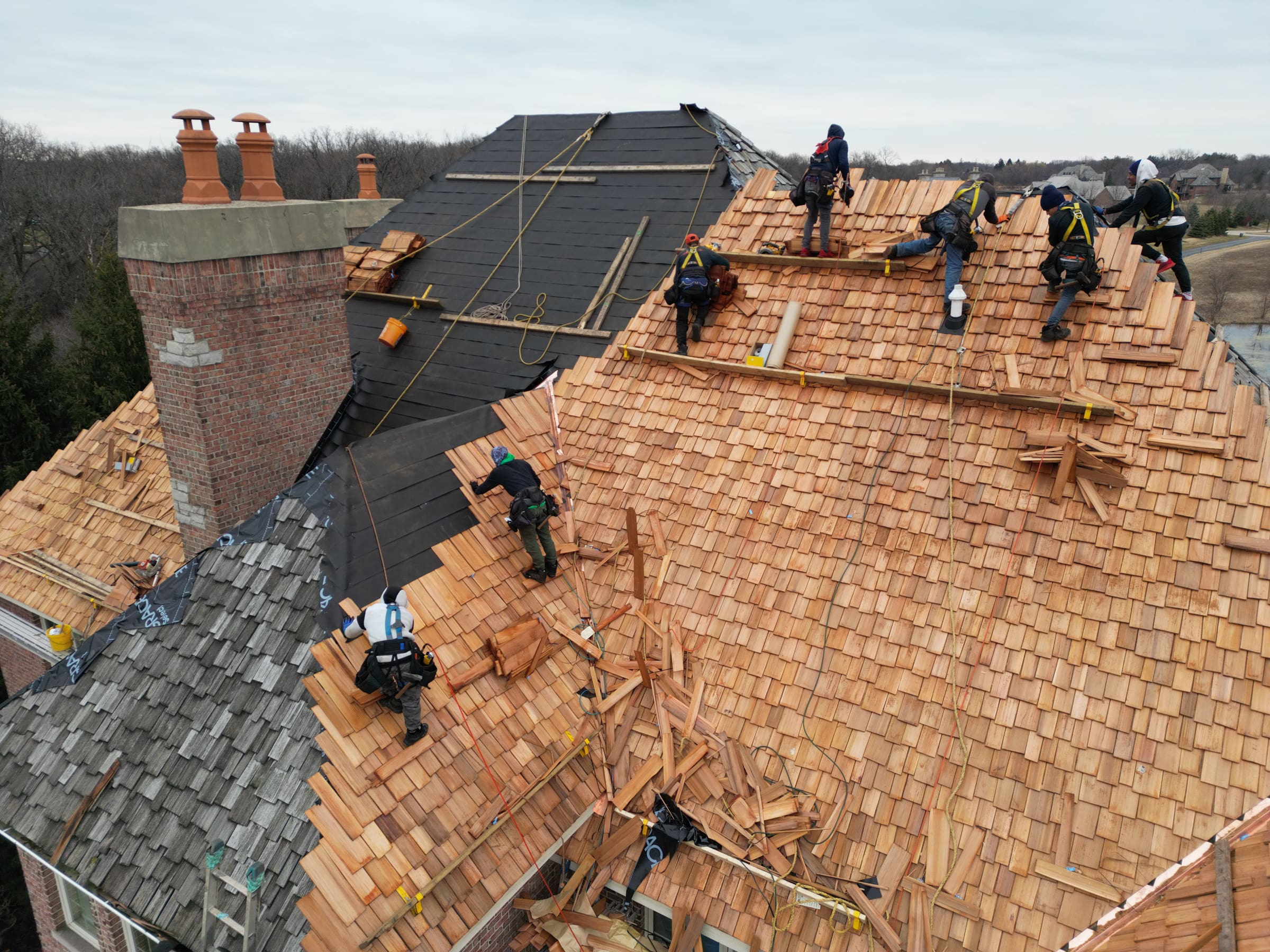Full Roof Replacement: Removal of damaged cedar shake and installation of a new system.